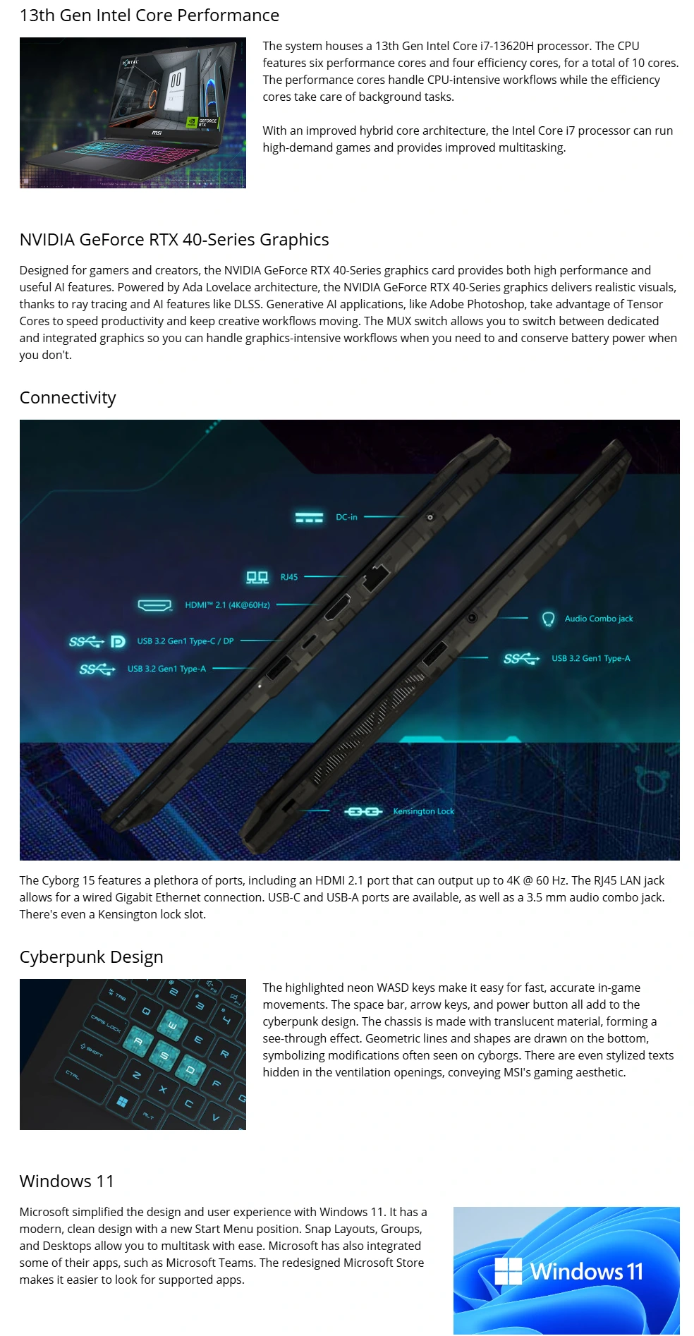 | PROCESSOR (CPU): | 13th Gen. Intel® Core™ i7-13620H, 3.6~4.9GHz, 10 Cores, 16 Threads, 24MB Cache |