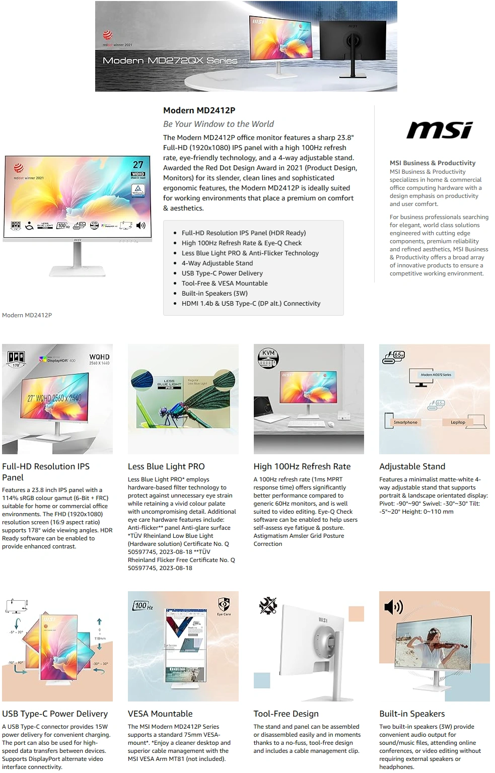Eye Protection: TÜV certified with MSI EyesErgo, Anti-Flicker, Less Blue Light PRO, and Eye-Q Check to reduce eye strain.